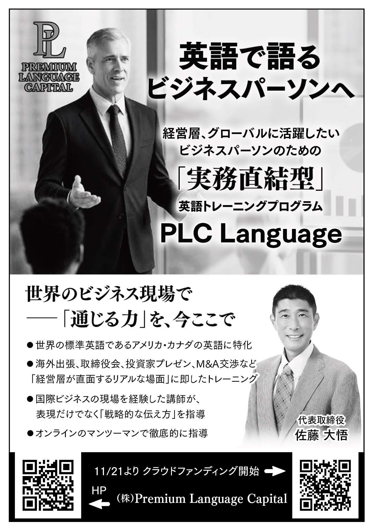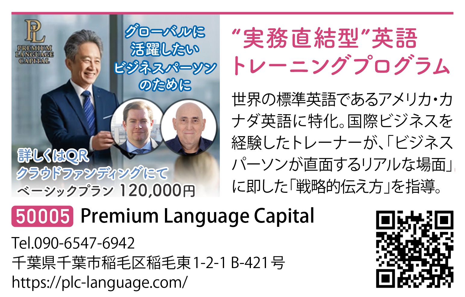 これらの「ゼロ → 事業化 → 拡大 → エグジット」の実務経験と国際ネットワークを土台に、PLCでは IR・ピッチ、投資家・顧客・ビジネスパートナーとの商談、Eメール・資料作成、会議運営、プレゼンテーションまで、成果直結の英語運用を現場仕様で鍛えます。言語 × 戦略 × 実務を一体で整えることで、クライアントの意思決定と成約率の最大化を目指します。
